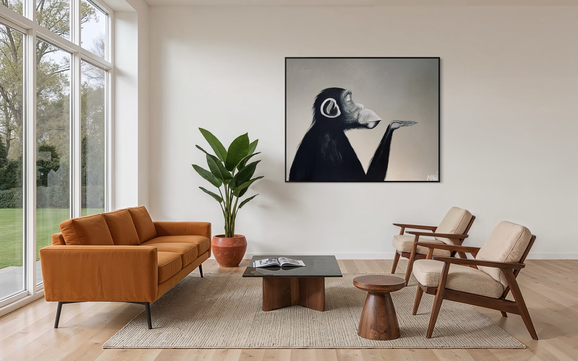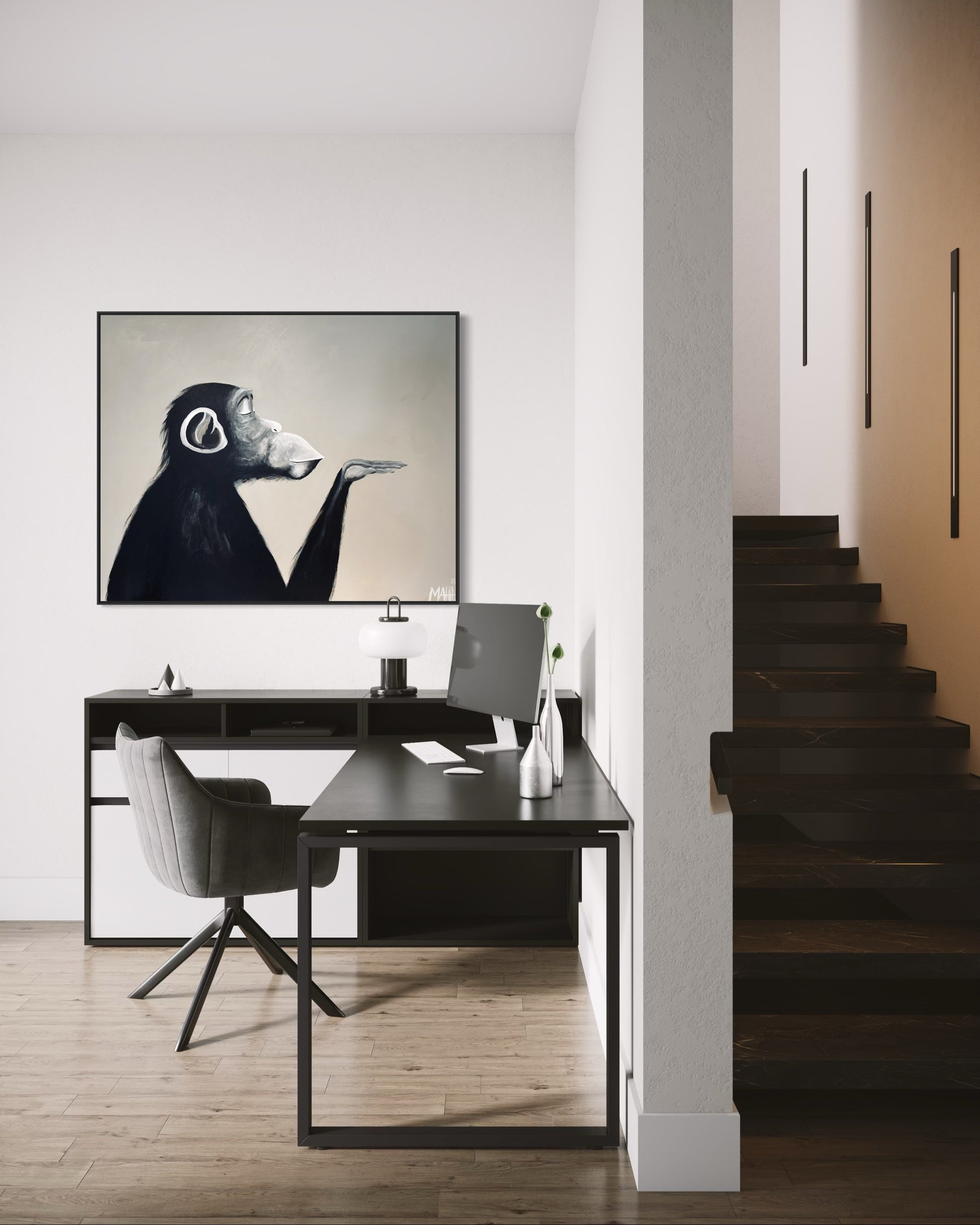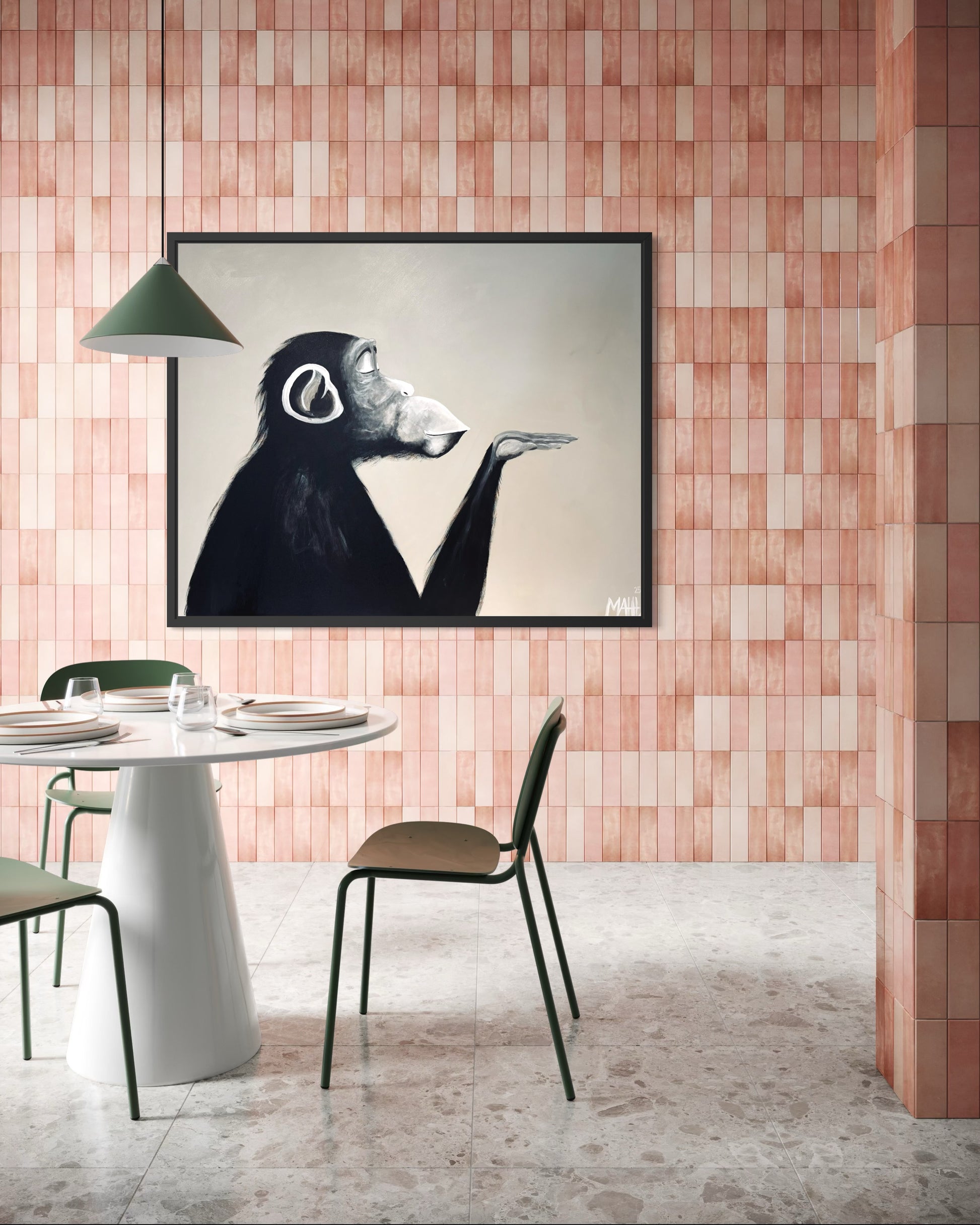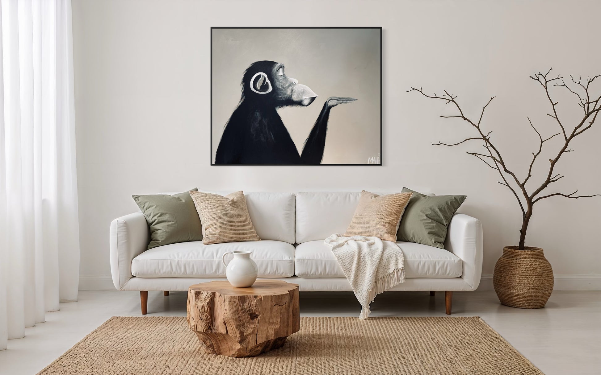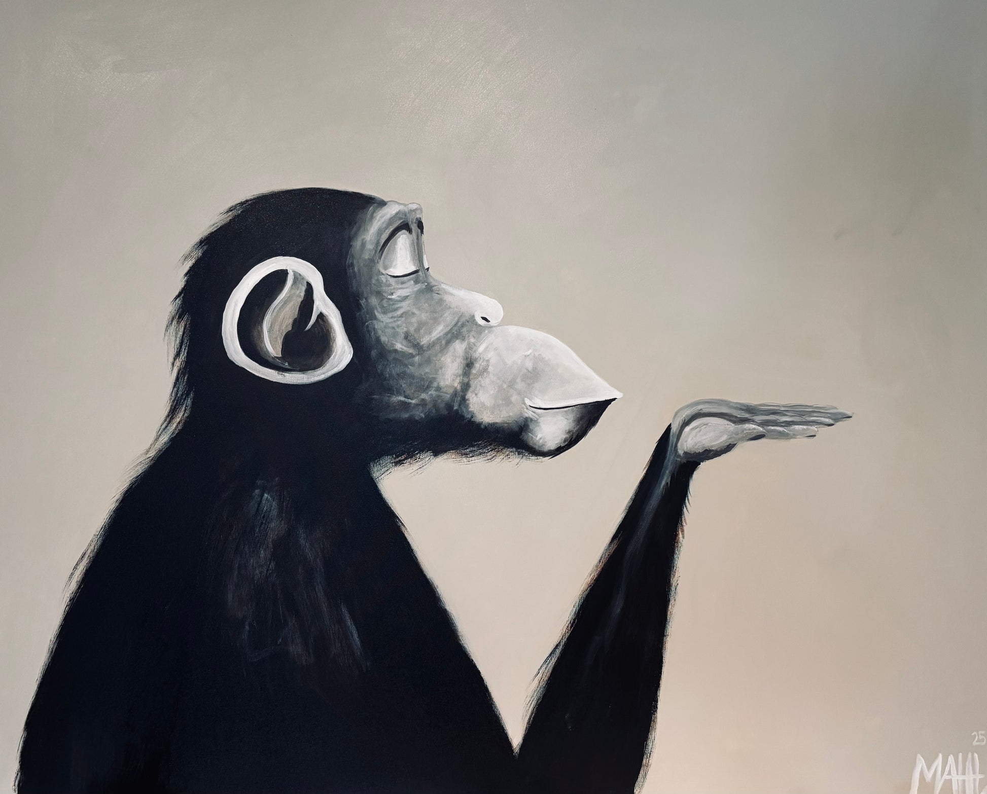 Kysseaben giver et smil på læben og vil skabe glæde i dit hjem. Et originalt værk, 100x120 cm akryl på lærred kan indrammes hvis du ønsker det. Malet af Mette Ahlgreen 2025.