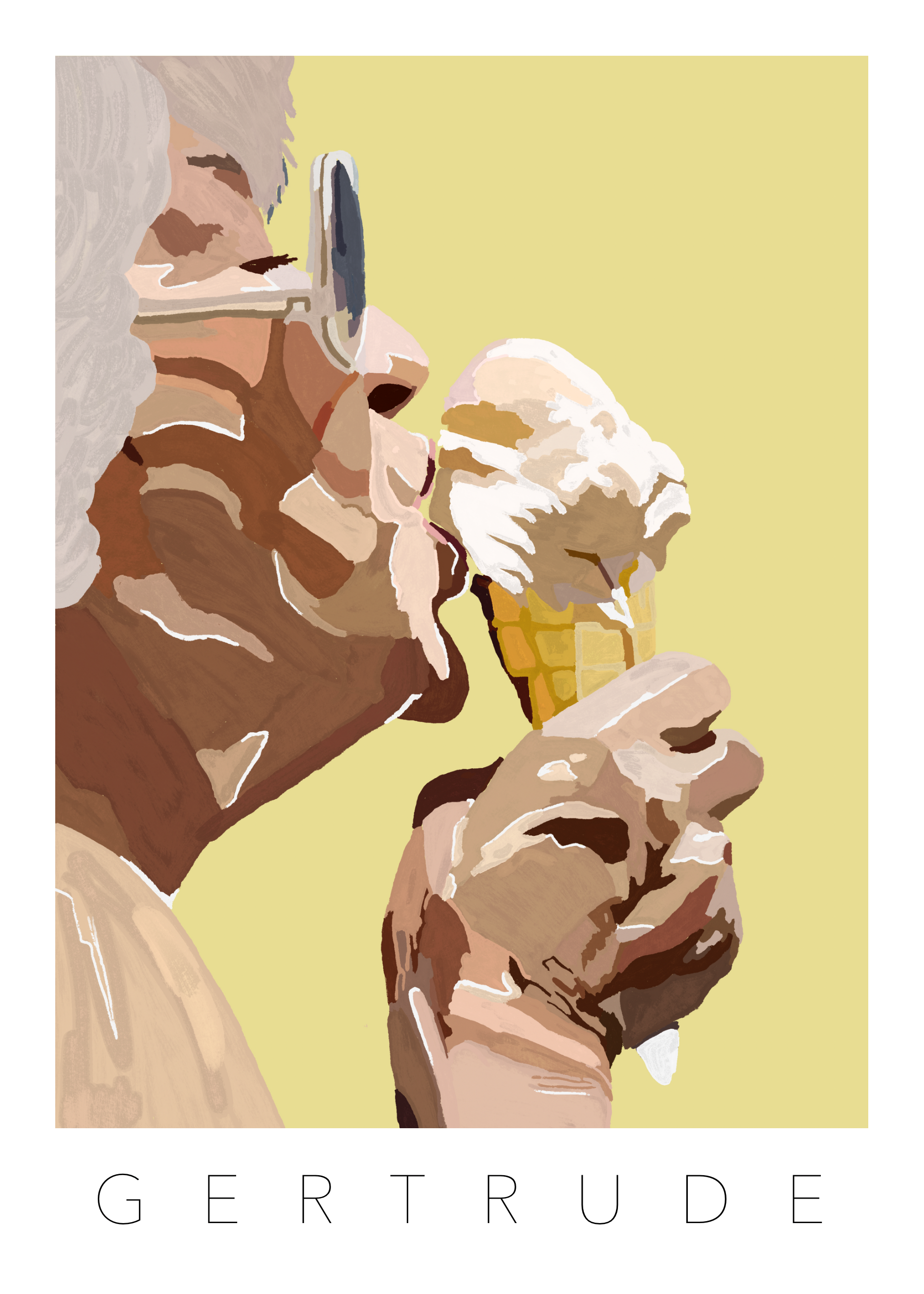Gertrude er et portræt af eftertænksom nydelse — en kvinde, der har lært, at livets sødme findes i de stille øjeblikke.